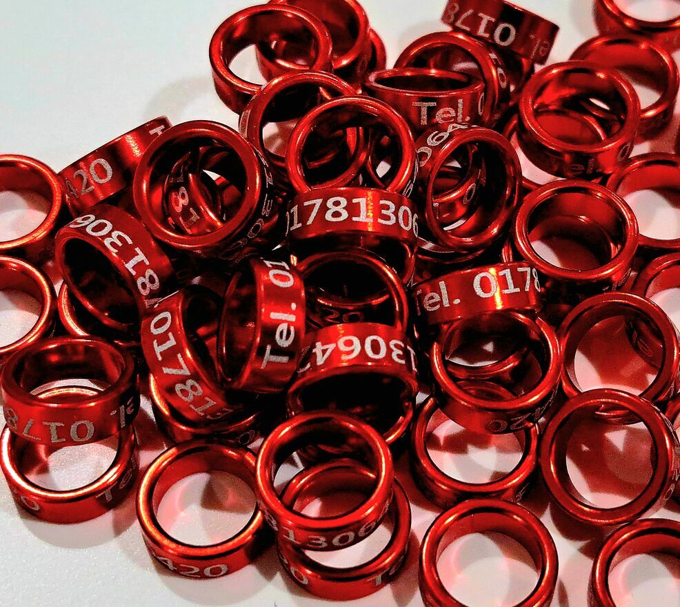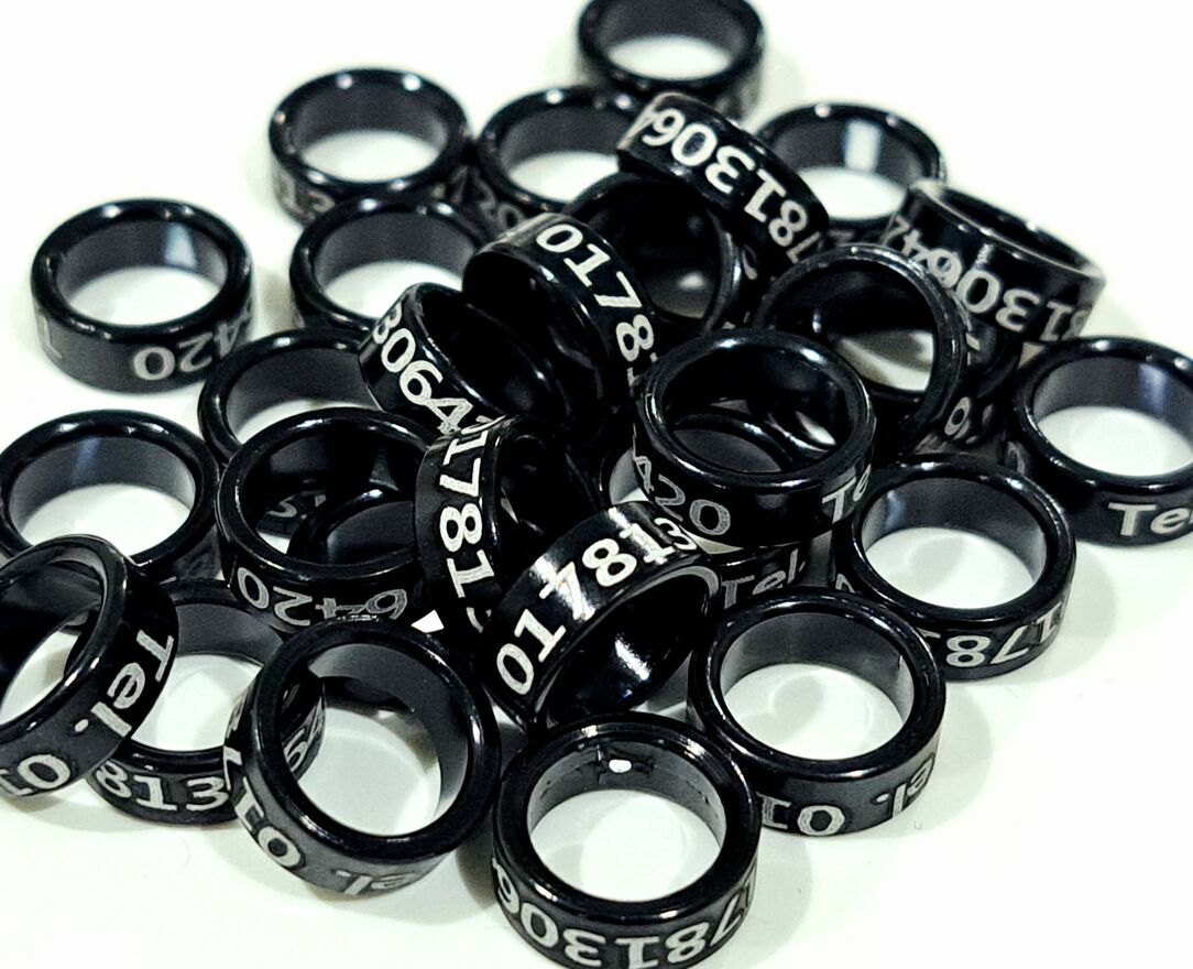 Obrączki aluminiowe z grawerowanym numerem telefonu hodowcy.WĄSKIE fi 8 x 4 mm