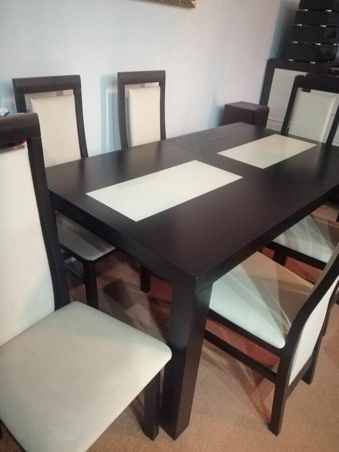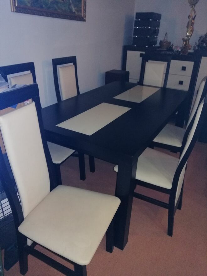 Solidny stół koloru wenge z beżowumi wkładkami oraz sześć dopasowanych krzeseł w bardzo dobrym stanie. Meble idealnie nadają się do jadalni lub kuchni. Praktyczny i funkcjonalny zestaw, który ożywi każde wnętrze.Mało używane w bardzo dobrym stanie. Wymiary: 90x165 po rozłożeniu ok 220cm.
